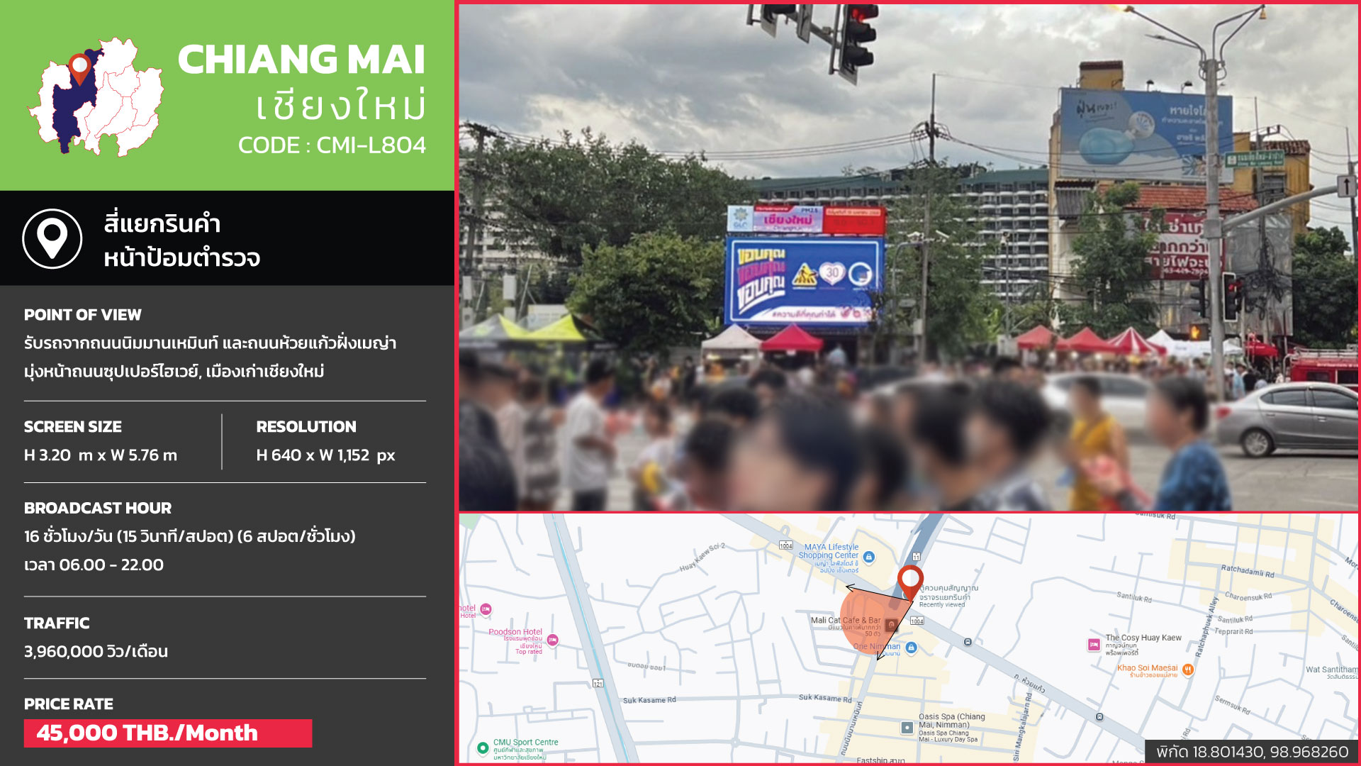 เช่าจอ LED เชียงใหม่ (แยกรินคำ) จอติดสี่แยกรินคำ การจราจรหนาแน่น ตลอดทั้งวัน รายละเอียดจอ LED รินคำ เชียงใหม่ ขนาดจอ: กว้าง 5.76 ม. × สูง 3.2 ม. ความละเอียด: 1152x640p | อัตราส่วน 16:9 ปริมาณรถผ่าน: วันหยุด: 100,000–120,000 คัน/วัน